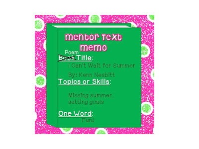 My students loved all of the poems and would often ask for me to read them again and again. One of the poems is called: I Can't Wait for Summer by Kenn Nesbitt. It is a fun poem that has kids thinking about summer, but realizing they have many more days until summer vacation. After I read it to my class, I put a note in my beginning of the year file to read when school started. I read it in the fall to my class and they thought it was mean because summer vacation was so far away. I used this poem as a jumping off point to talk about all we are going to accomplish in the days between the first day of school and summer vacation. We then created lists of what we wanted to do this year. I became a different way for us to set goals for the year.